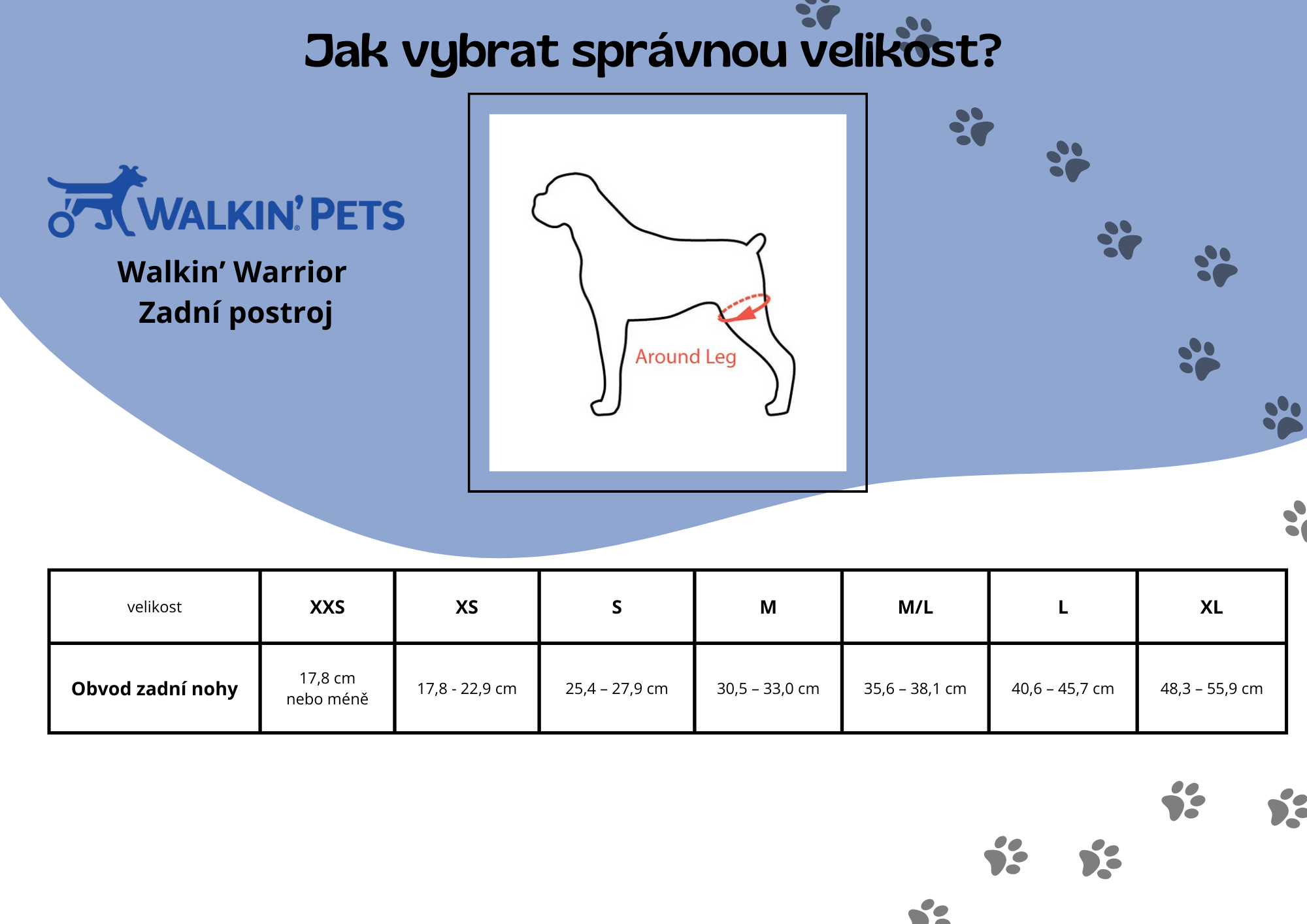 Pokud je váš pes v rozmezí velikostí, doporučujeme snížit velikost o jednu. Potřebujete pomoci s výběrem vhodné velikosti? Zavolejte nám na telefonní číslo +420 541 212 183, náš tým péče o zákazníky vám rád pomůže vybrat pro vašeho psa ideální velikost zadního postroje Warrior.