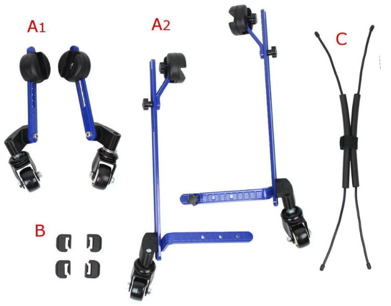 (A1 NEBO A2) 1 sada kol a vzpěr: V závislosti na velikosti, kterou potřebujete, obdržíte pouze jednu sadu kol a vzpěr. Miniaturní nástavec na přední kolo má 3 velikosti. Větší 2 velikosti (A2) jsou vybaveny podpěrnou stabilizační tyčí.